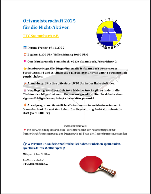 Für alle Jungen und Mädchen der Jahrgänge 2012 und jünger, welche Tischtennis ausprobieren möchten, führen wir am Samstag 15.02.2025 in der Schulturnhalle in Stammbach einen Mini-Ortsentscheid in drei Altersklassen durch.